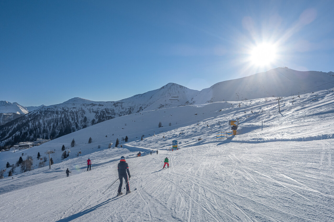 Schon allein die Zahlen beeindrucken: 214 Pistenkilometer, davon 47 blau, 112 rot und 27 schwarz sowie 28 km Skirouten. 460 Hektar Skifläche. 68 Anlagen. Unser hochgestecktes Ziel: der Masnerkopf, mit 2.828 Metern der höchstgelegenste Punkt des Skigebiets. Doch wir geben unsere Ambitionen schon nach der ersten Fahrt auf: Tim ist noch etwas wacklig auf den Beinen, er braucht noch ein wenig Übung. Und die BREITEN PISTEN locken derart, dass wir unseren Plan kurzerhand über den Haufen werfen und einfach nach Lust und Laune und ohne festes Ziel losfahren.