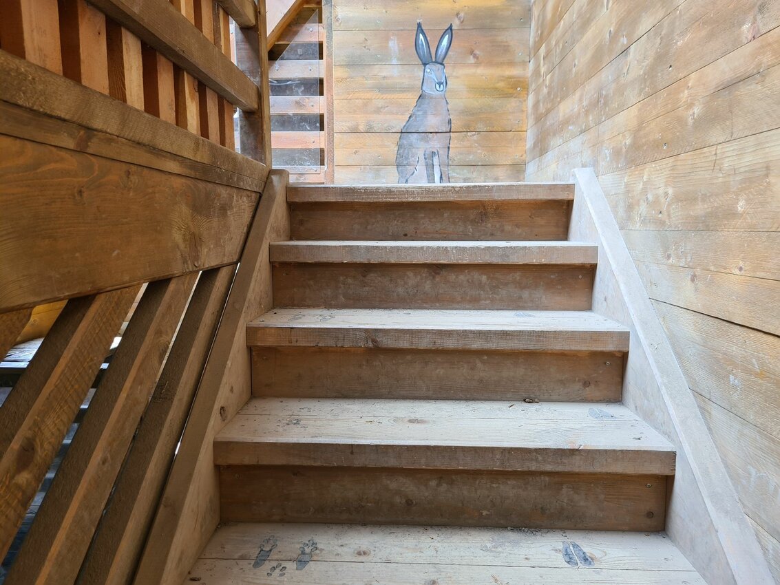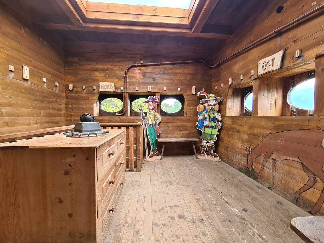 Aus der Ferne entdecken wir dann ein zweistöckiges Holzhaus mitten im Wald. Neugierig begutachtet Manuel es zuerst von außen, bis wir uns dann gemeinsam ins Innere wagen.