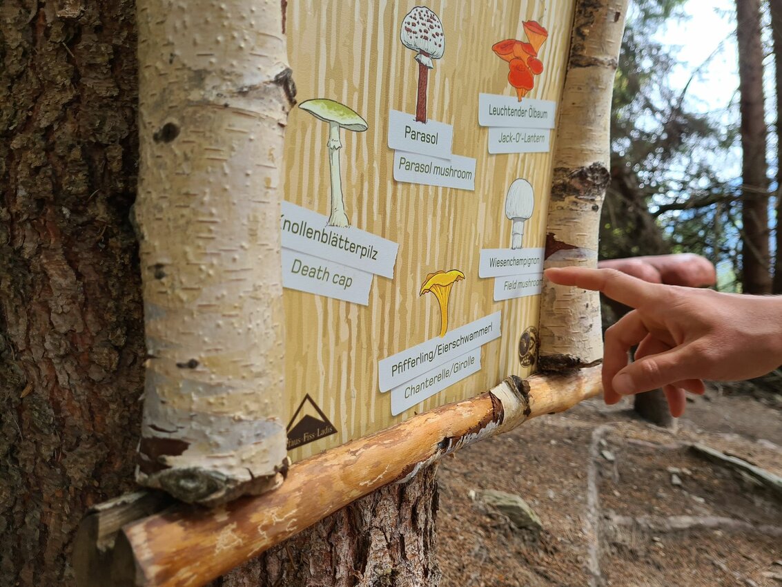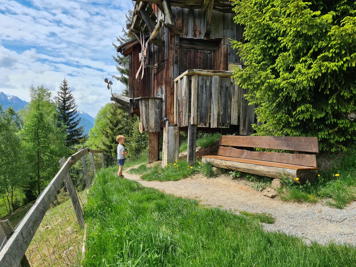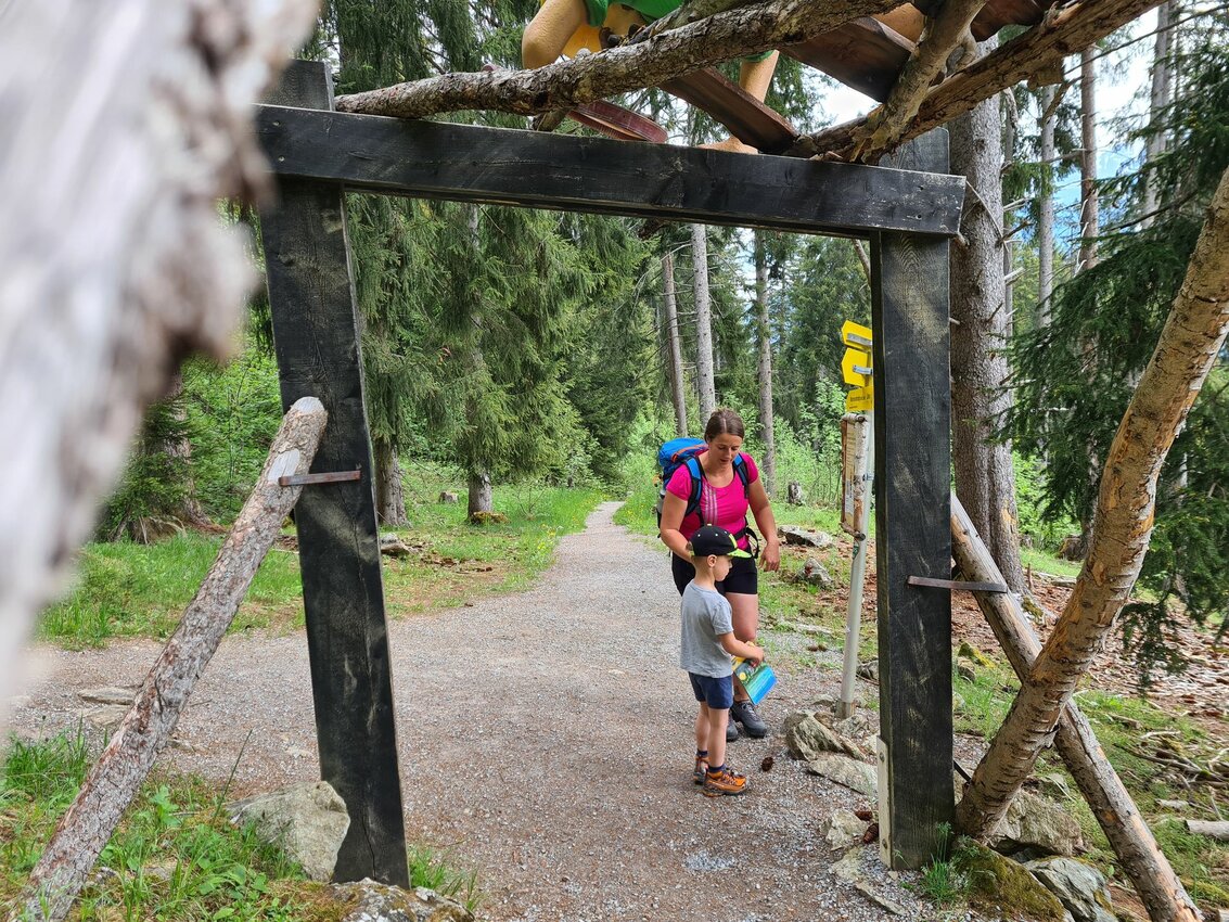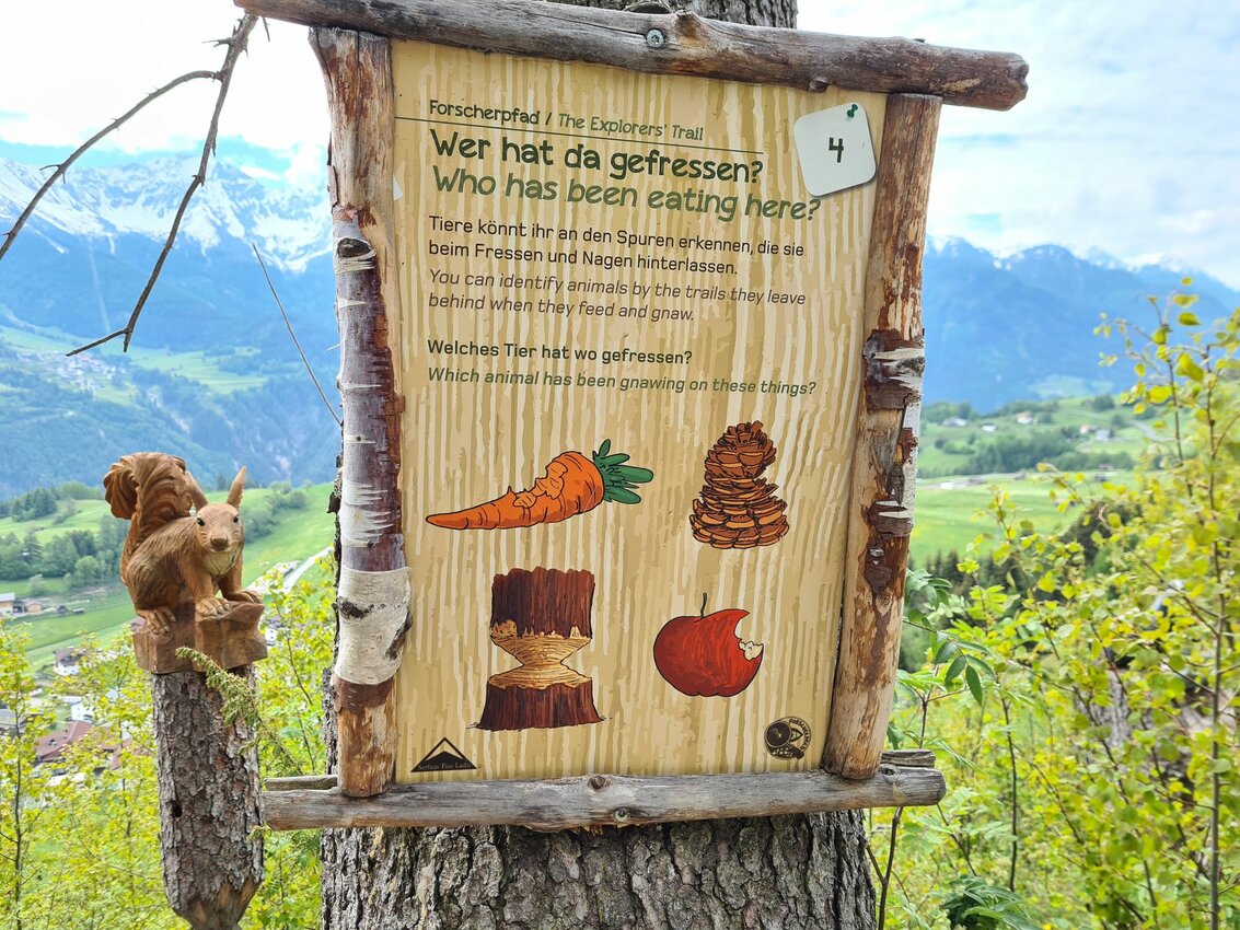 Der Forscherpfad ist von Fiss und Ladis aus begehbar. Da das mysteriöse Baumhaus aber unser Ziel ist, starten wir heute beim hübschen Schlossweiher in Ladis. Zu Beginn des Themenweges gelangen wir über den verspielten WASSERWANDERSTEIG (etwa 1 Stunde Gehzeit mit Erkundungstour), der die Aufmerksamkeit meines Sohnes wie ein Magnet auf sich zieht. Links zweigt der Weg dann auf den Forscherpfad ab, rechts geht es hinauf nach Obladis und Neuegg zum WODETURM.