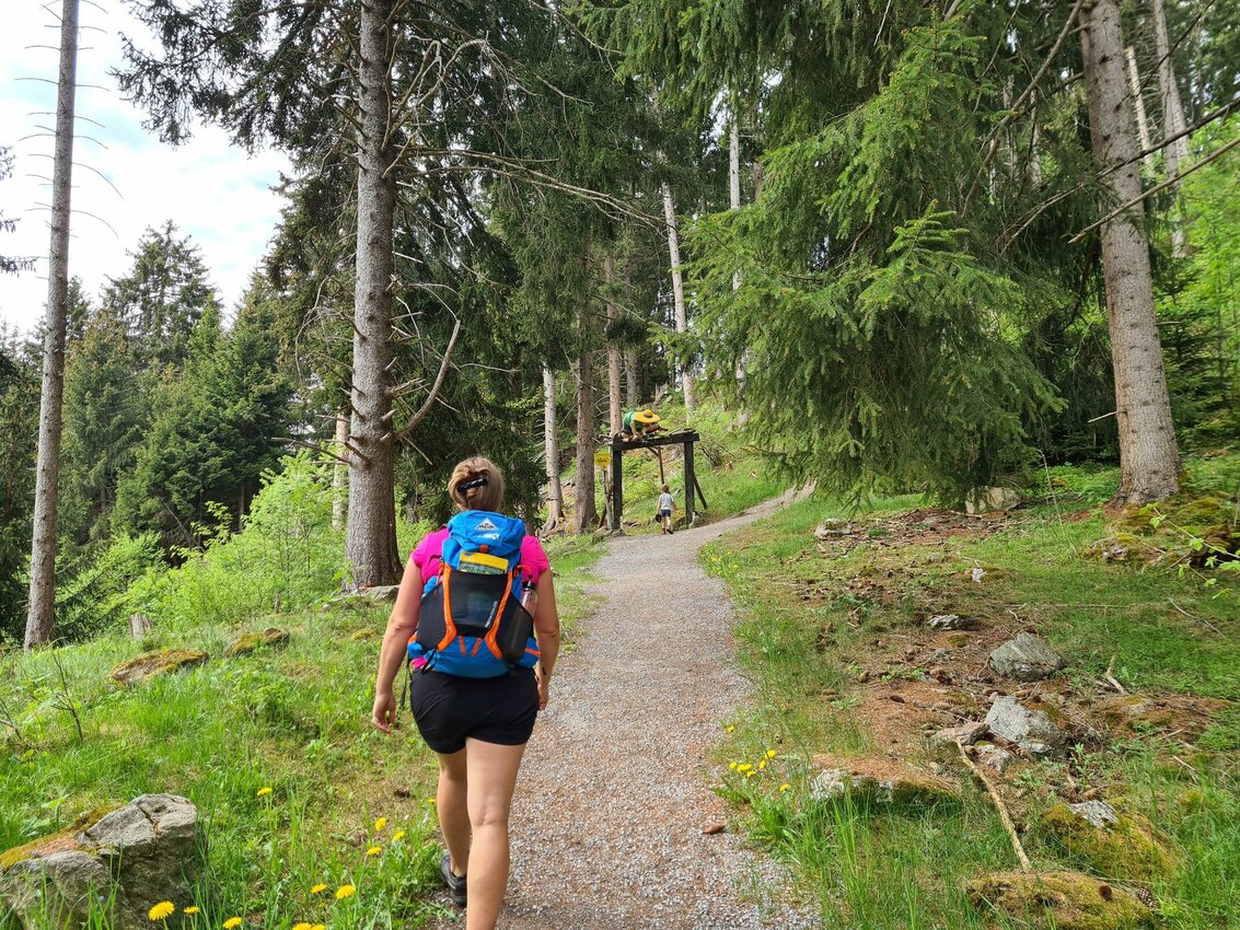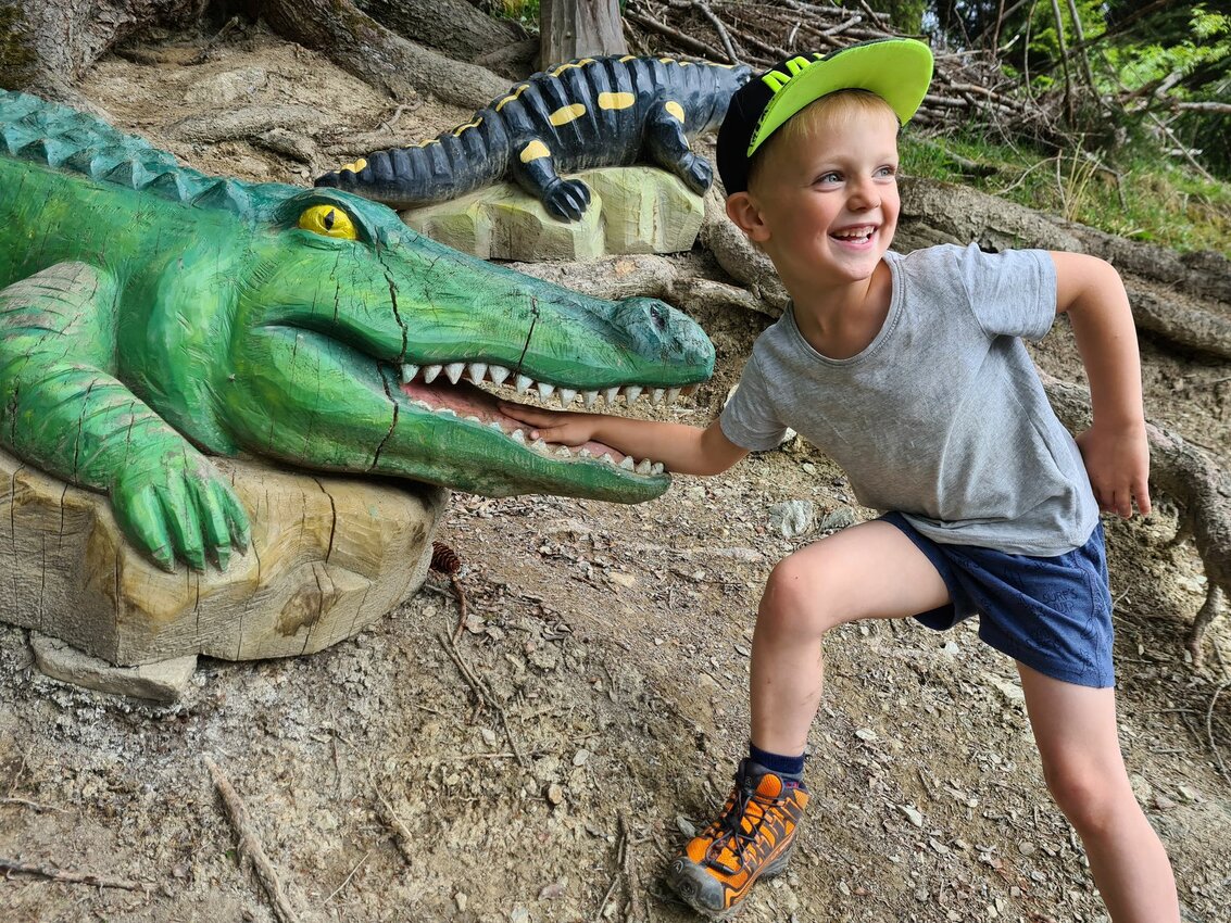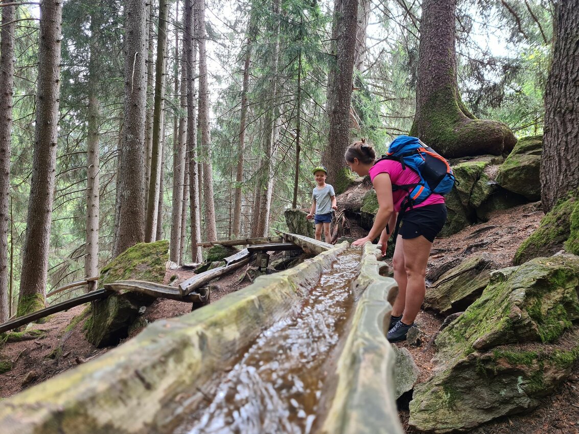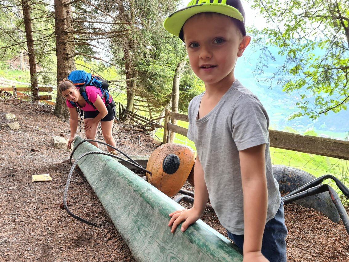 Der Forscherpfad ist von Fiss und Ladis aus begehbar. Da das mysteriöse Baumhaus aber unser Ziel ist, starten wir heute beim hübschen Schlossweiher in Ladis. Zu Beginn des Themenweges gelangen wir über den verspielten WASSERWANDERSTEIG (etwa 1 Stunde Gehzeit mit Erkundungstour), der die Aufmerksamkeit meines Sohnes wie ein Magnet auf sich zieht. Links zweigt der Weg dann auf den Forscherpfad ab, rechts geht es hinauf nach Obladis und Neuegg zum WODETURM.