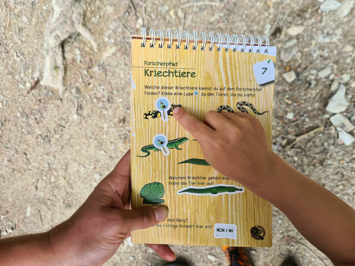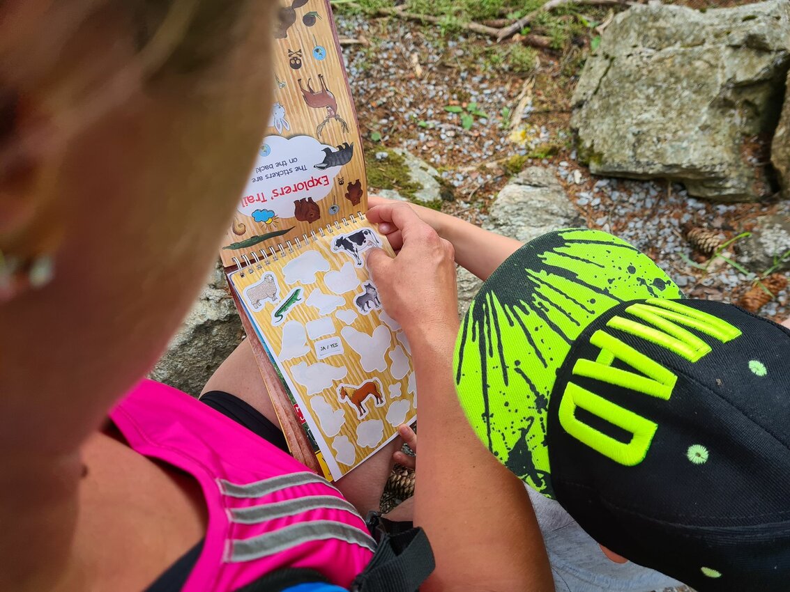 Der Forscherpfad führt in mehreren Stationen durch den schattenspendenden Wald. Manuel und ich fühlen uns winzig klein, denn alles um uns herum ist plötzlich RIESENGROSS. Mein kleiner Detektiv löst die Naturrätsel mit Bravour und klebt aufgeregt die STICKER auf die entsprechenden Seiten. Da behaupte noch einer, die guten alten Sticker würden die Kinder von heute nicht mehr begeistern.