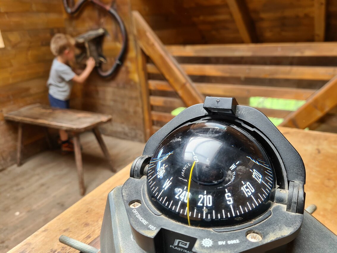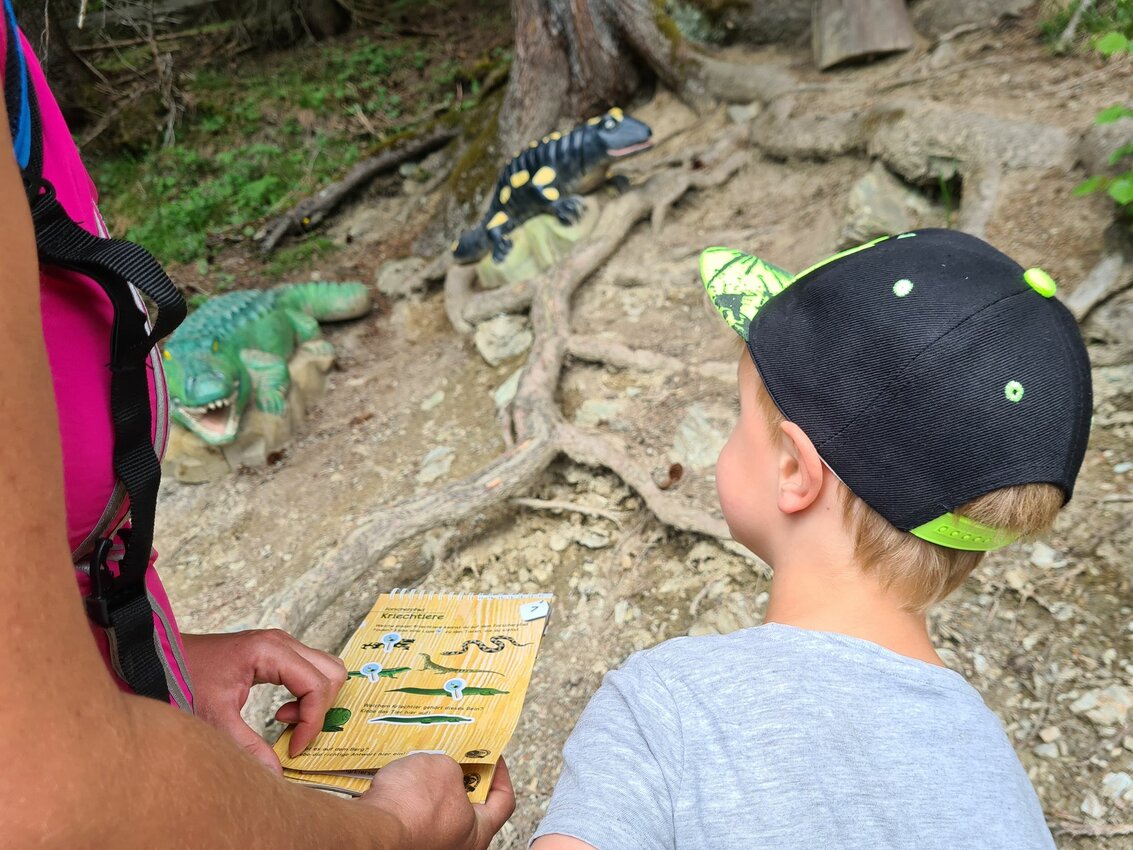 Ein riesiger Forscher mit gelbem Hut beäugt uns bereits am Eingangsportal mit seiner XXL-Lupe. Nun wird es Zeit, den Rätselblock mit den bunten Stickern, den wir im Infobüro in Ladis gekauft haben, auszupacken. Hinter dem Verkauf des Rätselblocks steckt übrigens ein VERSPRECHEN an alle kleinen Abenteurer. Die 3 Euro landen nämlich in einem Topf für den GUTEN ZWECK. Mit einem guten Bauchgefühl und reichlich Neugierde in unseren zappeligen Füßen blättern wir vorbei an den Rätseln des Piraten- und Hexenweges und starten unser Abenteuer im hinteren Drittel des Stickerblocks.