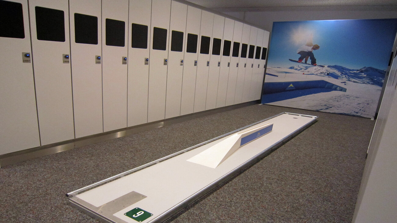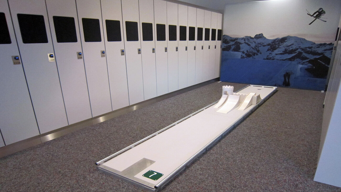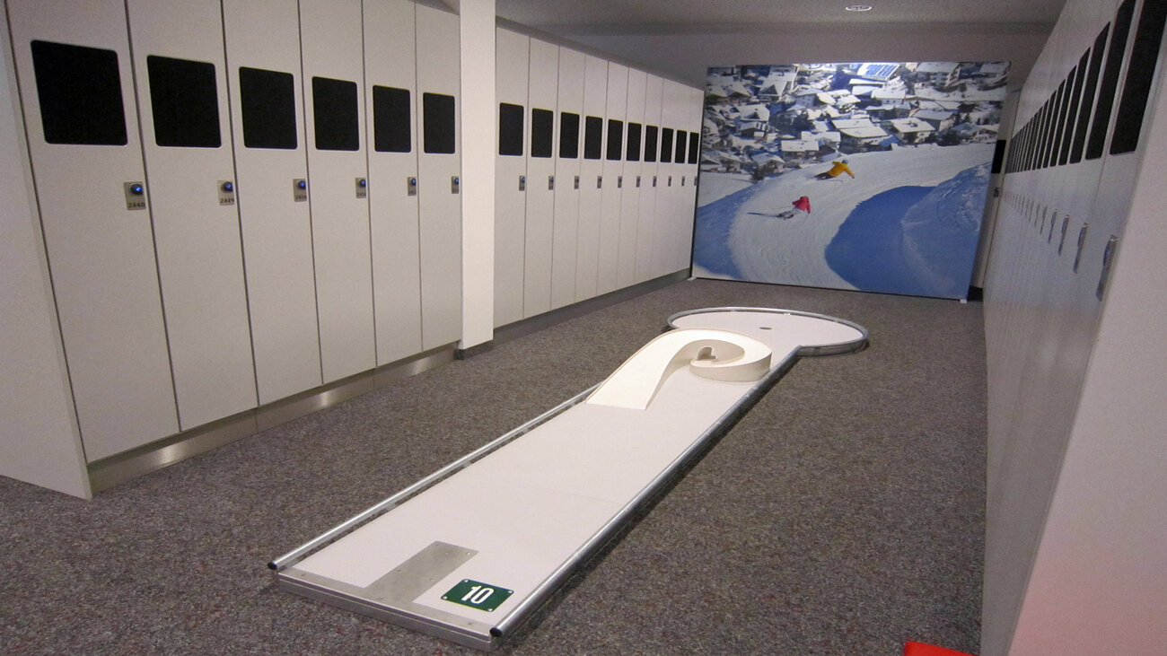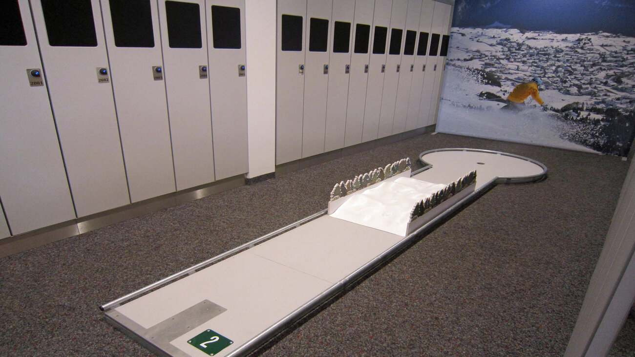Auf Bahn Nummer 7 wartete das nächste beeindruckende Hindernis. In Miniaturform wurde das Schloss der Nine Queens nachgebaut und über einen der 3 Kicker musste man den Minigolf-Ball in Richtung Loch befördern. Nach einer Wellenbahn, einem Rail-Hindernis, einer Steilkurve und vorbei an den Pistenbullys, ging es zum Zwölften und letzten Loch.