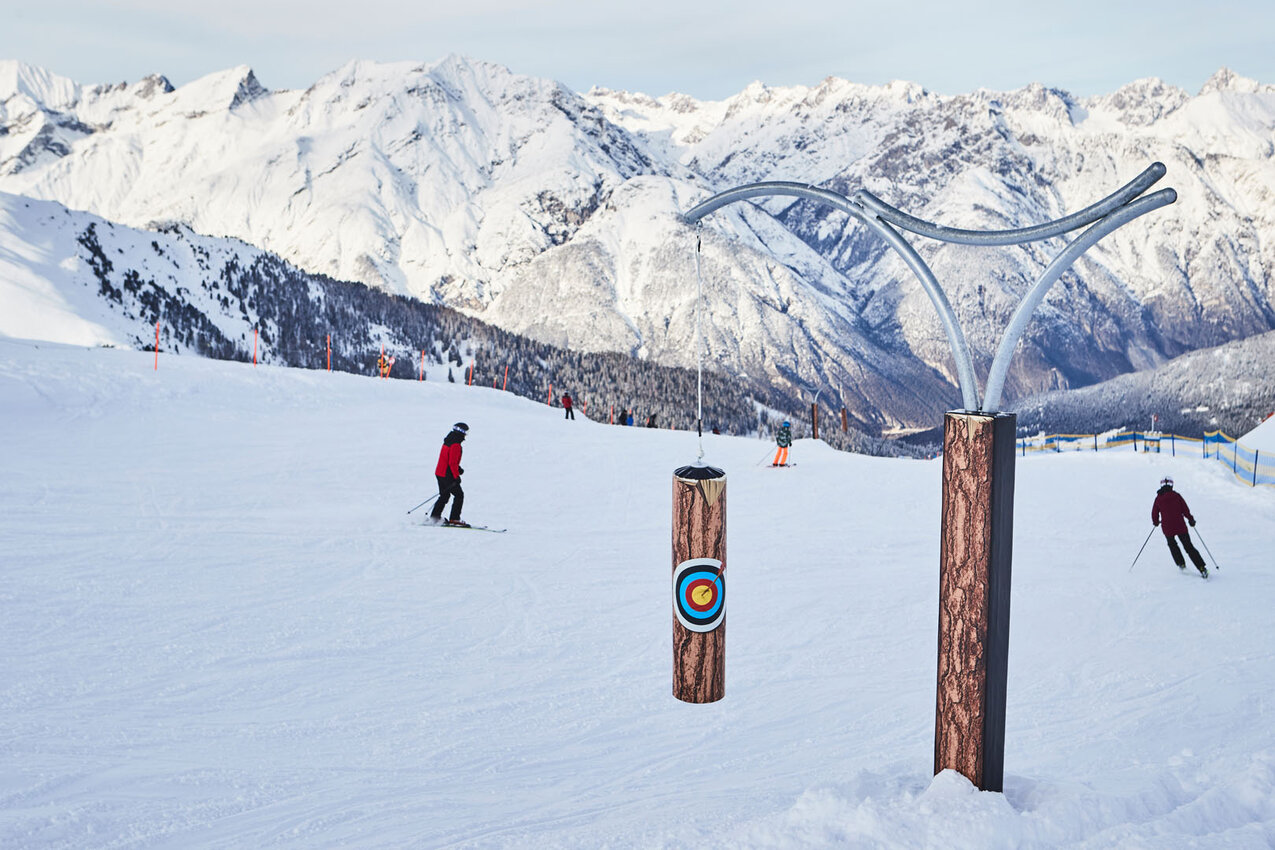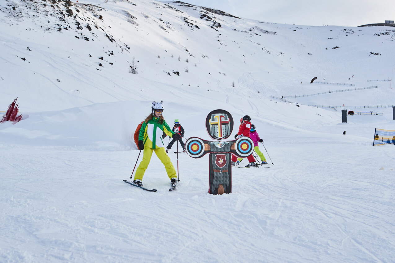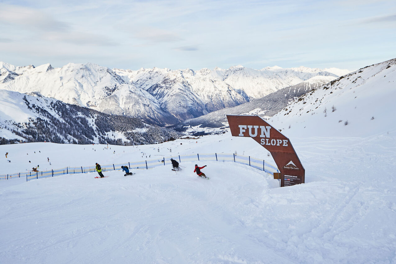 Los geht's an der großen Fun Slope-Tafel auf der Fisser Nordseite (Plazörabfahrt Nr. 21). Dort erwarten dich Sprünge, Wellen, Boxen, ein Tunnel und eine Schneeschnecke. Wenn du das alles gemeistert hast, kannst du noch mit einem High Five abklatschen. Du bist ein wahres Energiebündel und dein Action-Akku ist immer noch nicht voll geladen? Dann ab zum Airbag im Snowpark Fiss! Dort kannst du deine coolsten Jumps zeigen. Kleine Skizwerge wie Valerie und Elias fühlen sich aber auf der Fun Slope so wohl, dass sie gleich noch mal fahren wollen.