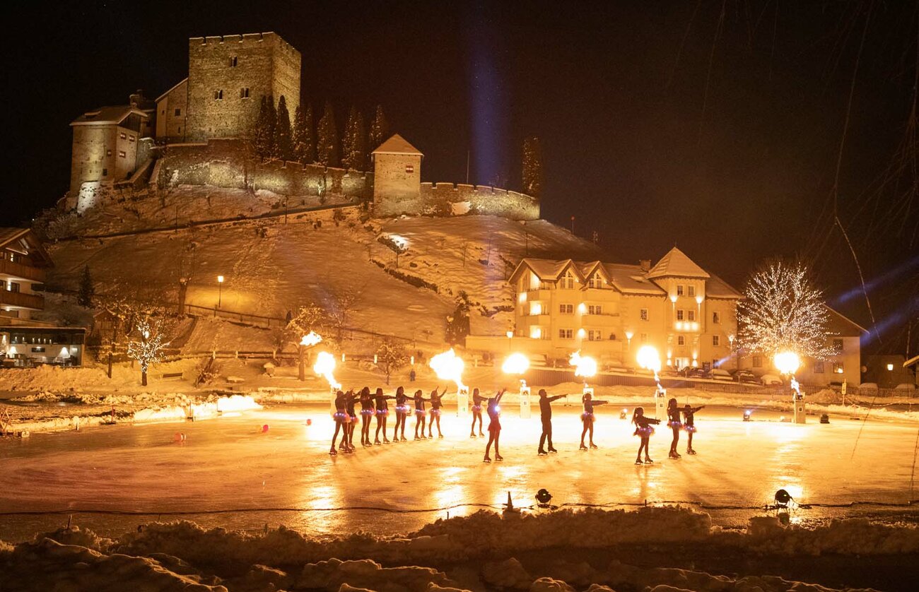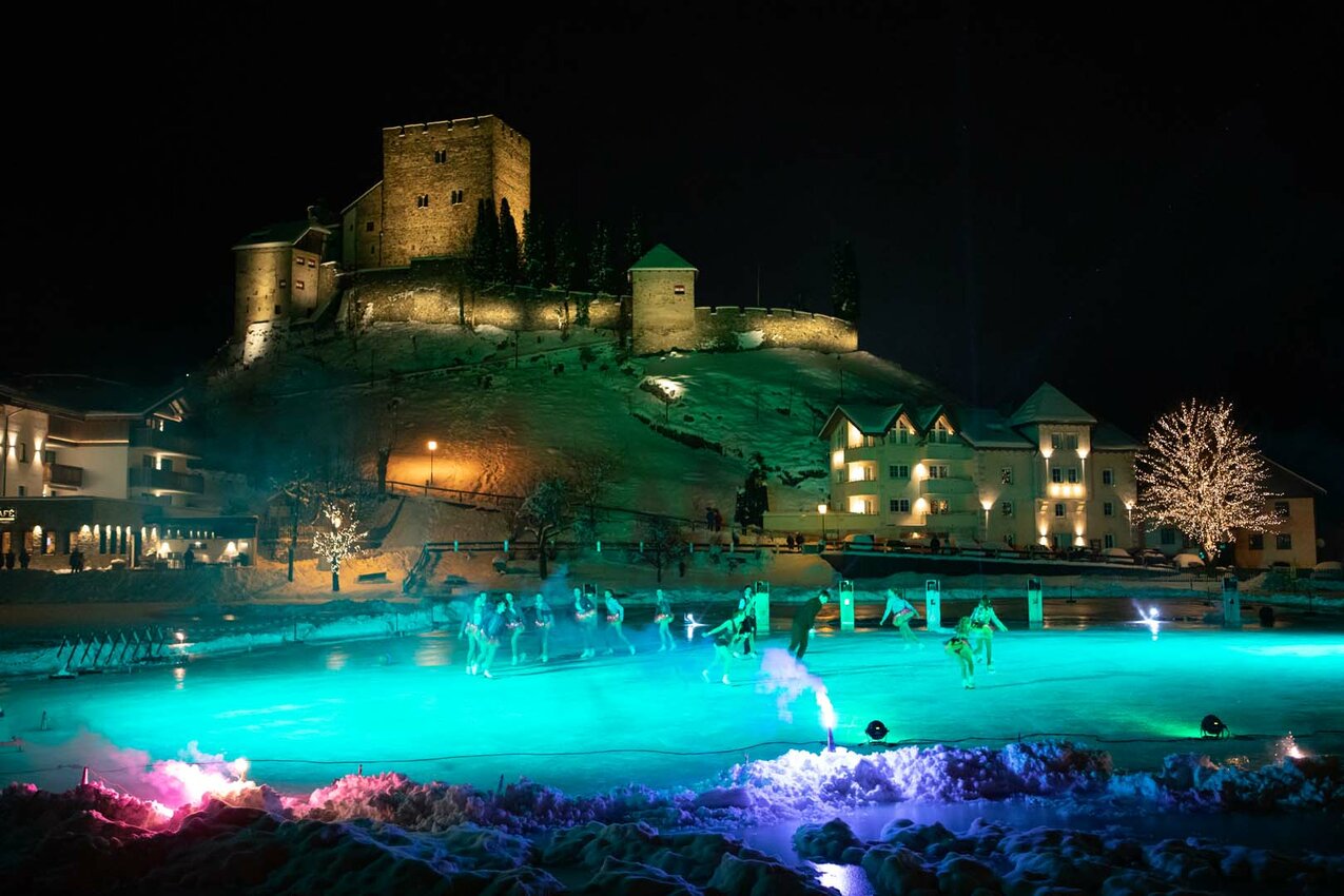 Am Fuße der beleuchteten Burg Laudeck, umgeben von den mittelalterlichen Bauernhäusern mit ihren bemalten Fassaden und direkt am gefrorenen Schlossweiher gelegen, präsentiert Ladis nach Liftschluss ein einmaliges Programm – „Magic Ladis“.