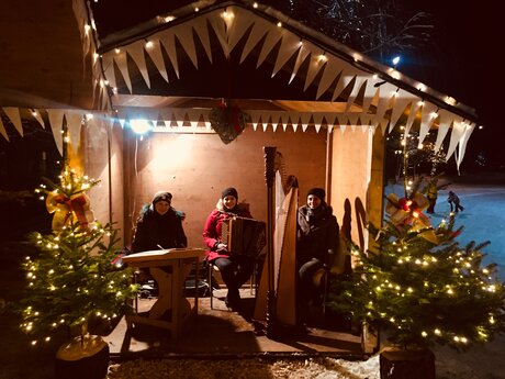 von Raclette über Tiroler Schinken bis hin zu süßen Köstlichkeiten. Ein gemütlicher Treffpunkt bei Glühwein, Punsch und vielen anderen Getränken sorgt unterhalb der mächtigen Burg Laudegg für einen romantischen Ausklang eines tollen Wintertages.
