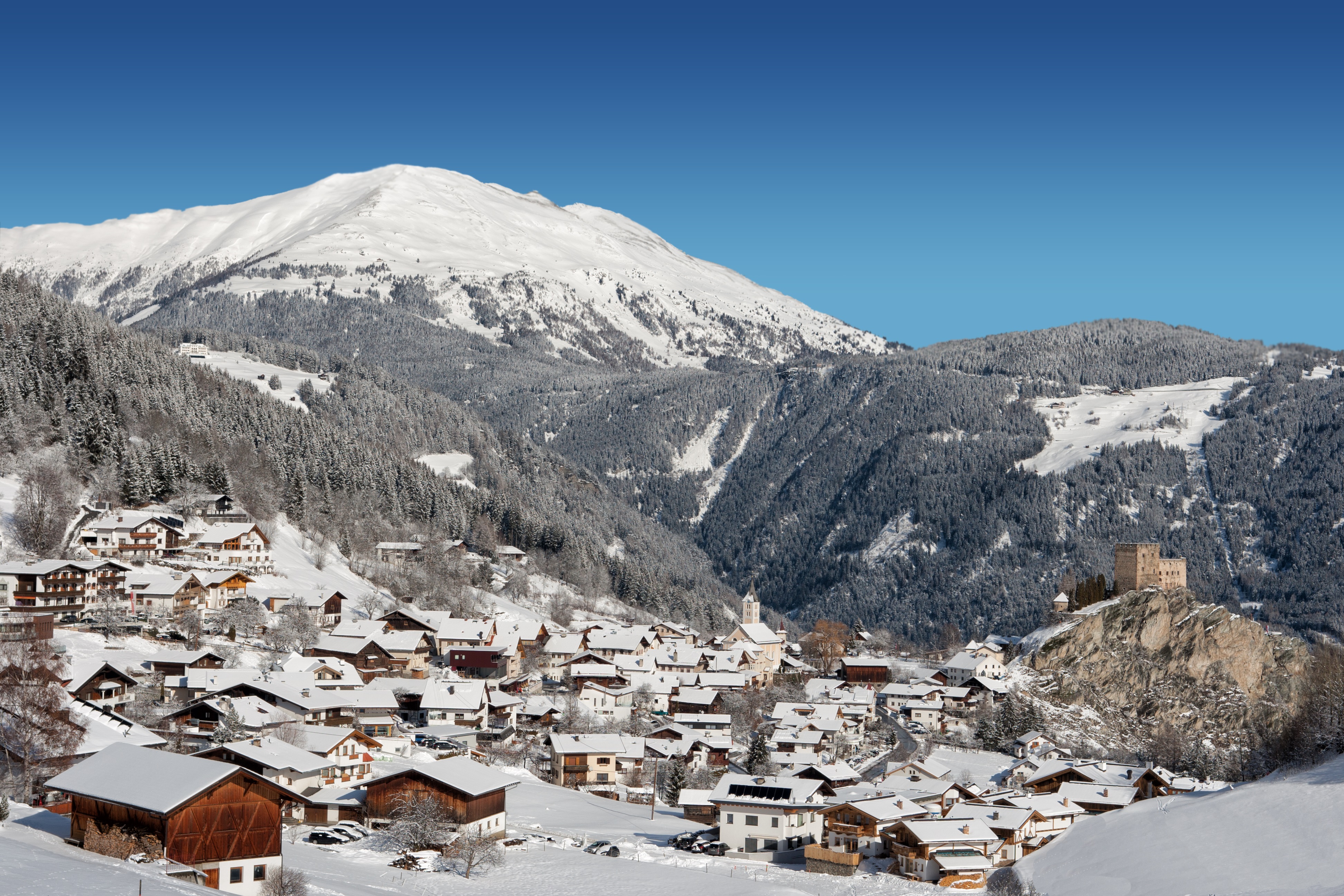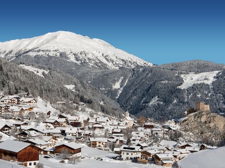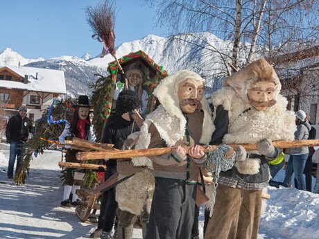Das beschauliche Dörfchen Fiss hat 1.040 Einwohner und versprüht noch heute den ursprünglichen Charme eines rätoromanischen Haufendorfs. Erst 1928 bekam Fiss eine eigene Zufahrtsstraße, vorher gab es nur einen von Hand angelegten Karrenweg für Ochsengespanne. Größte Sehenswürdigkeit ist der 600 Jahre alte Ortskern mit den Bauernhäusern und ihren wuchtigen, halbrunden Hauseingängen und den engen, verwinkelten Straßen. Kein Wunder, dass sich dort alte Bräuche erhalten haben. Zum Beispiel das Fisser Blochziehen. Dabei ziehen traditionell verkleidete Männer aus Fiss einen Zirbenbaum, den Bloch, durch den Ort. Die wahrscheinlich originellste Fasnachtstradition im Alpenraum diente einst der Vertreibung der bösen Wintergeister und ist seit Oktober 2011 immaterielles Kulturerbe der UNESCO in Österreich. Der Umzug findet nur alle vier Jahre statt, das nächste Mal am 25. Januar 2026. Wer noch mehr zu den lokalen Traditionen erfahren möchte, besucht das Heimatmuseum s'Paules und s'Seppls Haus. Es befindet sich in einem stattlichen Hof, der mit seinem großen Rundbogentor, den winzigen Fenstern und der kunstvoll verzierten Dachkonstruktion die Aufmerksamkeit auf sich zieht.