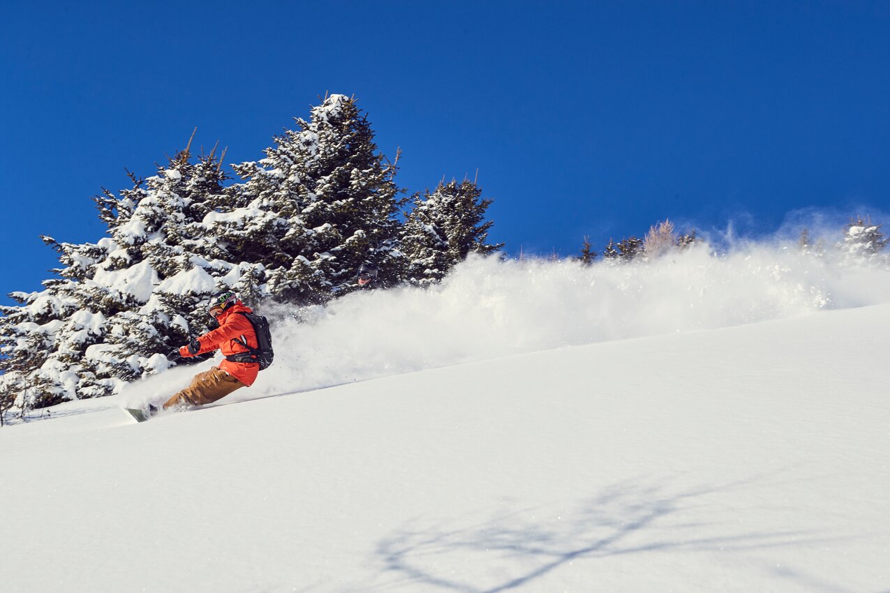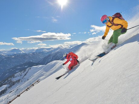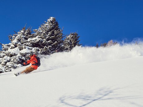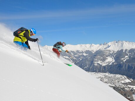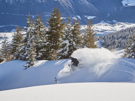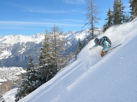 Wie überall gilt auch in Serfaus-Fiss-Ladis: Wer die Piste verlässt, muss die komplette Sicherheitsausrüstung, bestehend aus Lawinenpiepser, Sonde, Schaufel, Erste-Hilfe-Paket und natürlich einen Helm dabeihaben. Und auch damit umgehen können! Übung macht den Meister. Wer einmal in den Powder reinschnuppern will, aber noch wenig Erfahrung hat, der trainiert auf den zwölf markierten Freeride-Routen. Hier unsere Empfehlungen: Tiefschnee-Einsteiger lieben die Adlerroute. Die zieht sich vom Gipfel des Zwölferkopfs (2.596 m) parallel zur schwarzen Adlerpiste hinab zur Schöngampalm (1.882 m). Fortgeschrittene Variantenfahrer finden in der Skyline den schwerelosen Himmel auf Erden. Diese kurze und mittelschwere Tiefschneeabfahrt zweigt am Speichersee unterhalb des Schönjöchls (2.509 m) rechts von der Frommesabfahrt ab und endet direkt an der Frommes Alp (1.700 m). Das absolute Highlight für ambitionierte Tiefschneetaucher ist und bleibt aber die Skiroute mit dem bezeichnenden Namen Kamikaze. Wie ein Sturzkampfpilot fällt man vom Zwölferkopf-Gipfel (2.596 m) fast senkrecht nach unten Richtung Möseralm (1.820 m). Wenn die Kamikaze-Skiroute nach Neuschnee erstmalig geöffnet wird, gilt sie als der Deep-Powder-Dream von Serfaus-Fiss-Ladis!