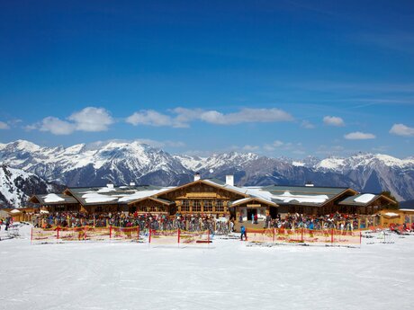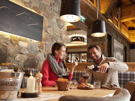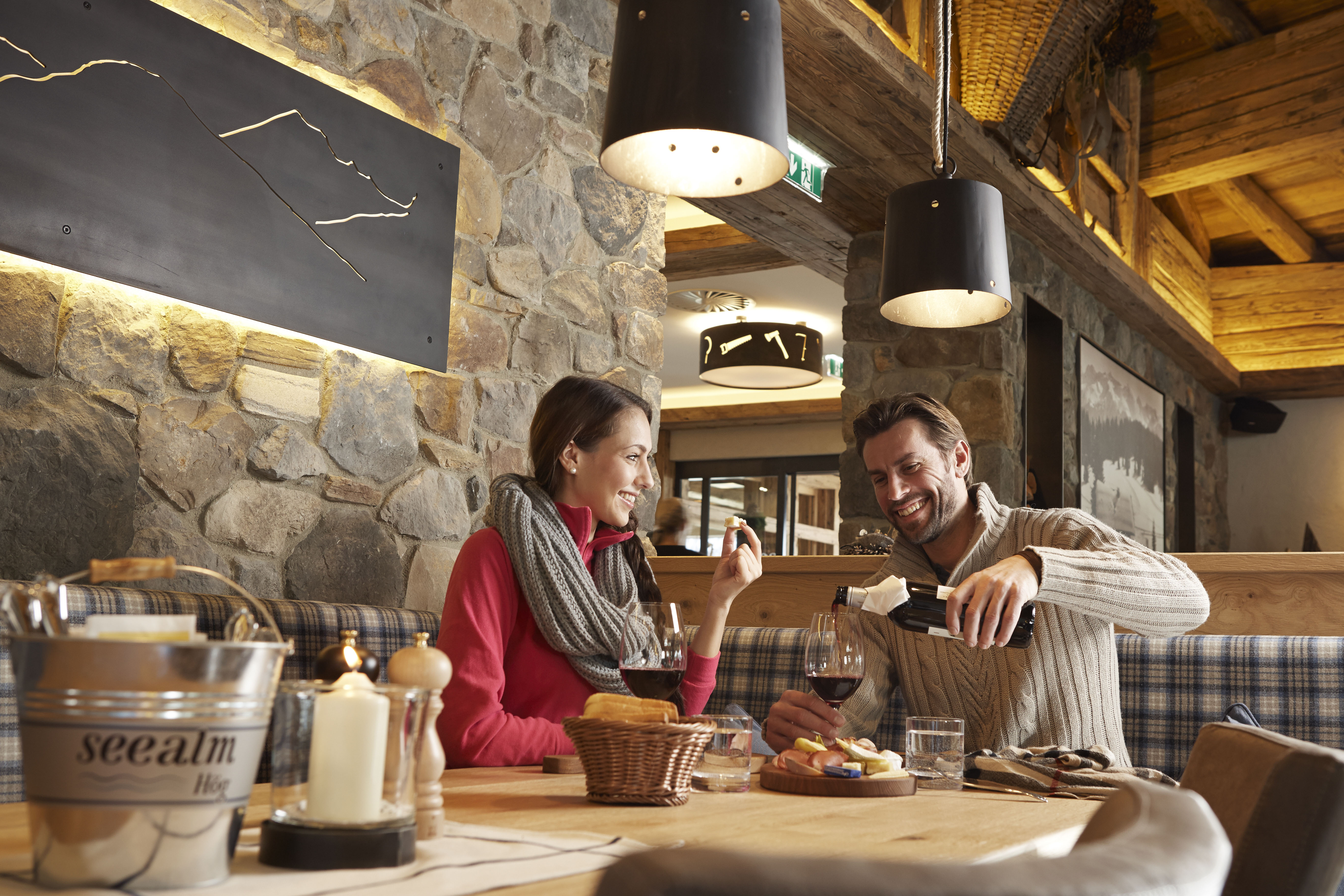 Die Seealm Hög bietet dank offener Bauweise und großer Fensterfronten tolles Nah- und Fernseherlebnis auf den Högsee und die Bergwelt. Und die Speisekarte? Die überrascht mit vegetarischer und veganer Küche sowie mit Fischspezialitäten. An milden Spätwintertagen kuschelt man sich in einen der Liegestühle – und genießt den Speise- und Getränkeservice auf der Sonnenterrasse.