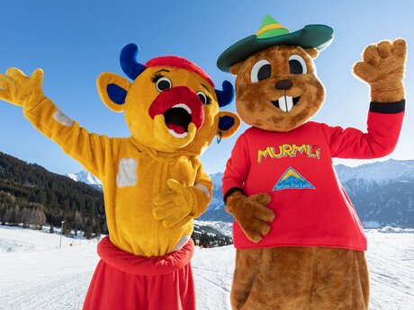 • Zwei Maskottchen stehen den Kindern zur Seite: das Murmeltier namens Murmli in Serfaus und die Kuh Berta in Fiss