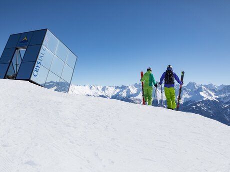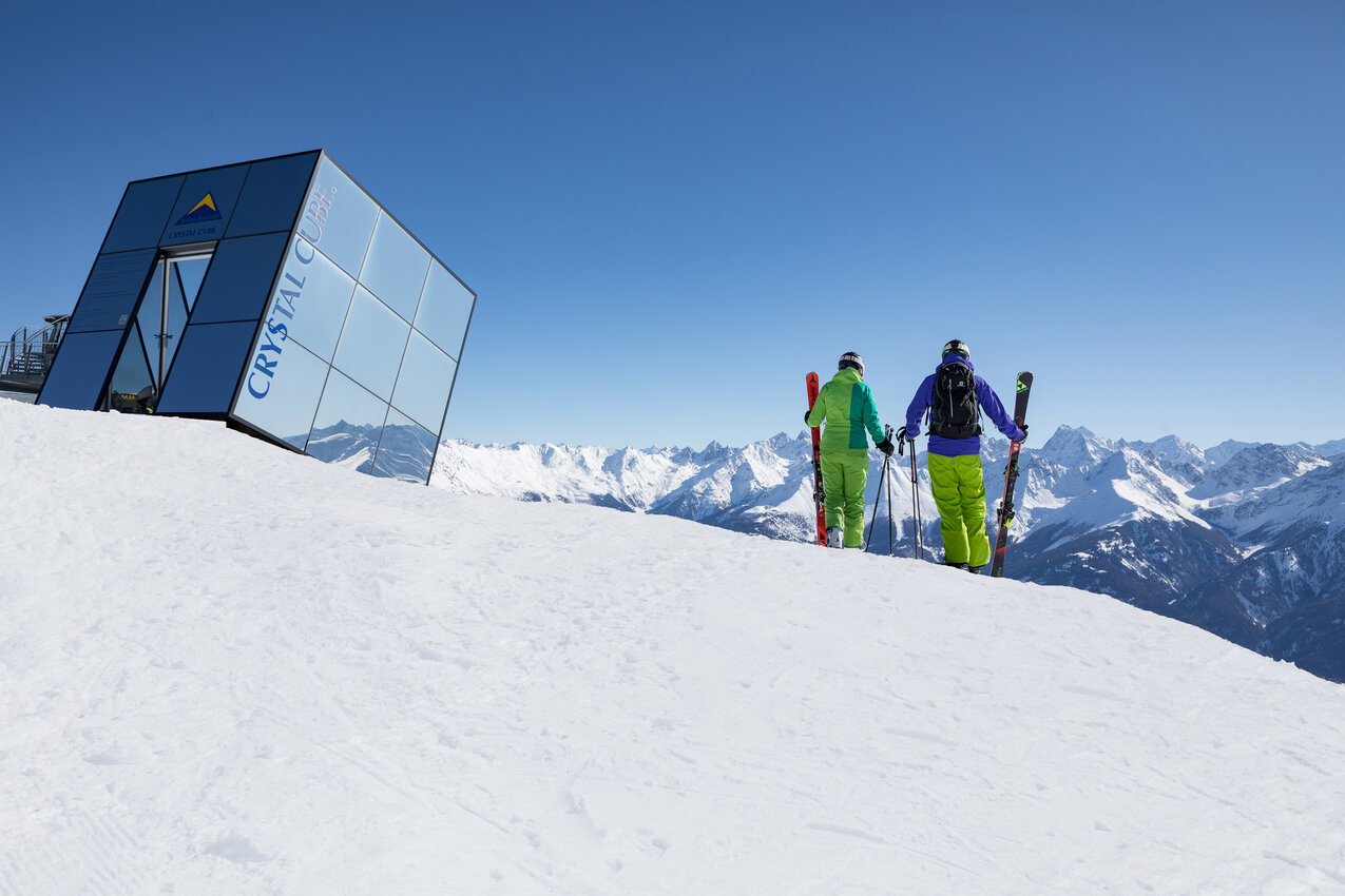 Der komplett verspiegelte Riesenwürfel mit Gourmetrestaurant steht im Skigebiet in der Nähe der Aussichtsplattform Z1 auf 2.600 m Seehöhe. Er ist zudem