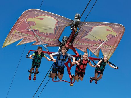 Noch mehr Nervenkitzel gefällig? Dann ab in den Sommer-Funpark Fiss! Ob auf dem 13 Meter hohen Sprungturm mit riesigem Luftkissen, in der Mega-Schaukel Skyswing mit drei verschiedenen Levels, im Fisser Flieger, der mit einer Höchstgeschwindigkeit von 80 km/h über die Köpfe der Besucher hinweg saust, oder auf der Sommerrodelbahn Fisser Flitzer, die zum Beispiel durch eine Dschungel- und eine Eishöhle fährt – hier steigt das Adrenalin und das Jauchzen der Kinder erfüllt die Luft.