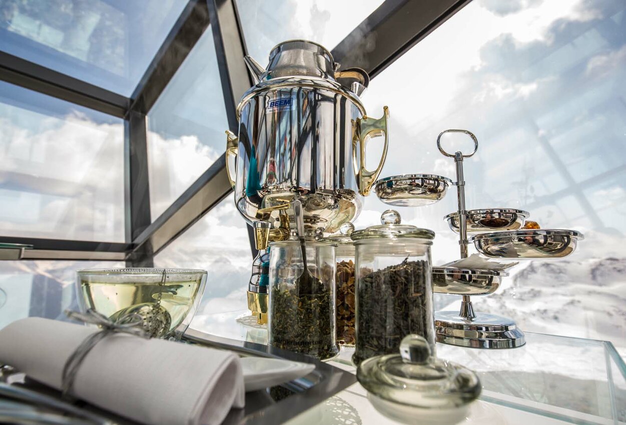 Durch die Komplettverglasung hat man im Inneren des Crystal Cubes beim Sektfrühstück einen fantastischen 360 Grad Rundum-Blick auf das sommerliche Bergpanorama. Nur gegen Vorreservierung. Auch im Winter werden unvergessliche Genussmomente geschaffen.