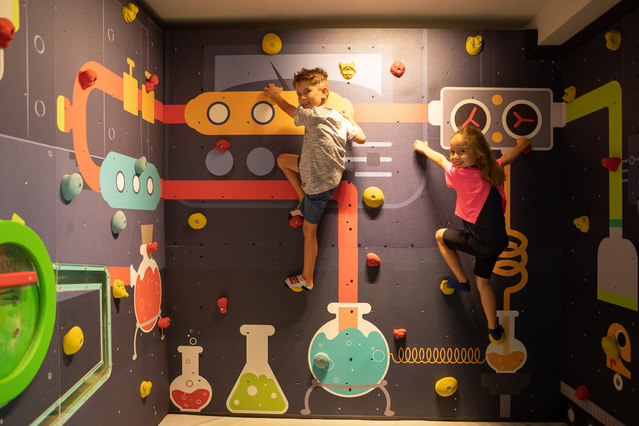 Der Boulderraum im PlayIN ist ein wahres Kinderparadies! Bunte, kindgerechte Griffe, weiche Matten und viel Raum für Fantasie verwandeln das sogenannte „Chemielabor“ in einen sicheren Boulder-Spielplatz. Ganz unter sich, dürfen die Kleinen auf den ausgeklügelten Routen unbeschwert drauflos klettern.