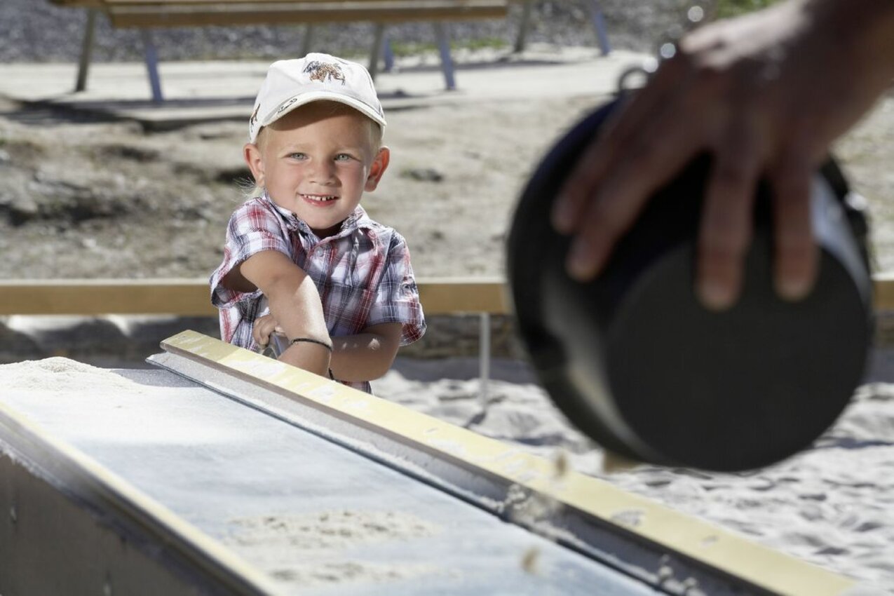 Bei der Goldwaschanlage befindet sich eine besondere Attraktion. Mit Wasser und Sand gefüllte Holztröge bergen jede Menge kleiner Schätze. Beim Waschen können sich in den Schöpfkellen eventuell sogar ein paar kleine Edelsteine finden. Suchen lohnt sich, versprochen!