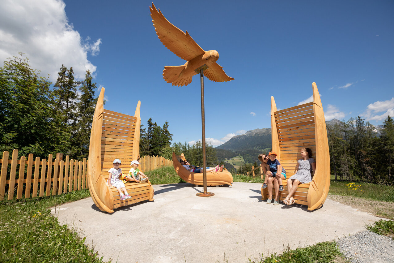 Ein kurzes Power-Napping auf der Wichtelliege, ein Abstecher in den Naschgarten zu den Himbeersträuchern oder Verstecken spielen unter dem riesigen Fliegenpilz! Zahlreiche Spielestationen, ein Märchenpavillon, der Geschichten vom Wode birgt, sowie ein zwölf Meter hoher Turm begeistern die Besucher. Oben angekommen, erwartet die Wanderer eine wundervolle Aussicht über das weitläufige Inntal bis zum Eingang des Kaunertals.