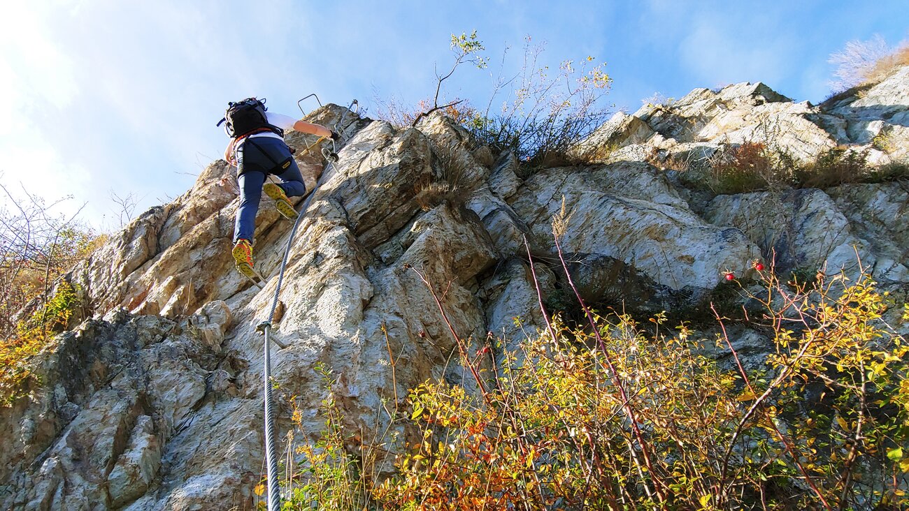 Der Pons Laudes Steig ist ein mittelschwerer Klettersteig mit etwas höherem Anspruch. Besonders die beiden steilen Passagen im Schwierigkeitsgrad C erfordern ordentlich Muskelkraft, da die Tritthilfen nur sparsam eingesetzt wurden.