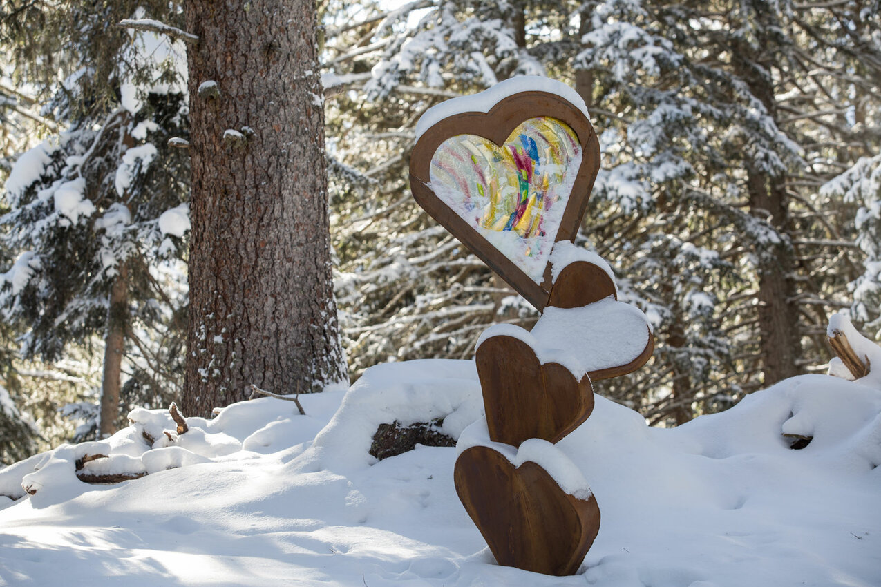 Auf 450 Metern Länge wird das "Vaterunser" durch 7 Skulpturen künstlerisch versinnbildlicht. Allesamt vom Serfauser Künstler Walter File, der auch das Interieur, die Fenster sowie die Eingangstür der Familien-Lichter-Kapelle Hög gestaltet hat.