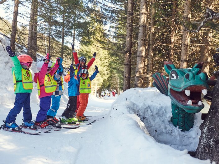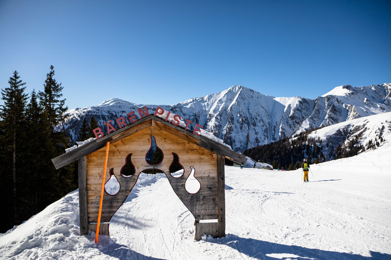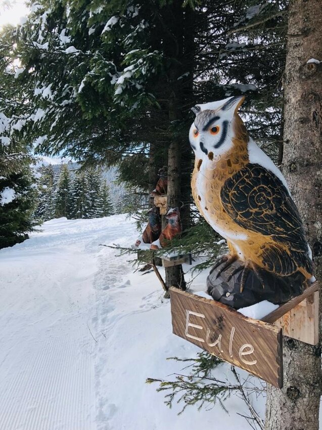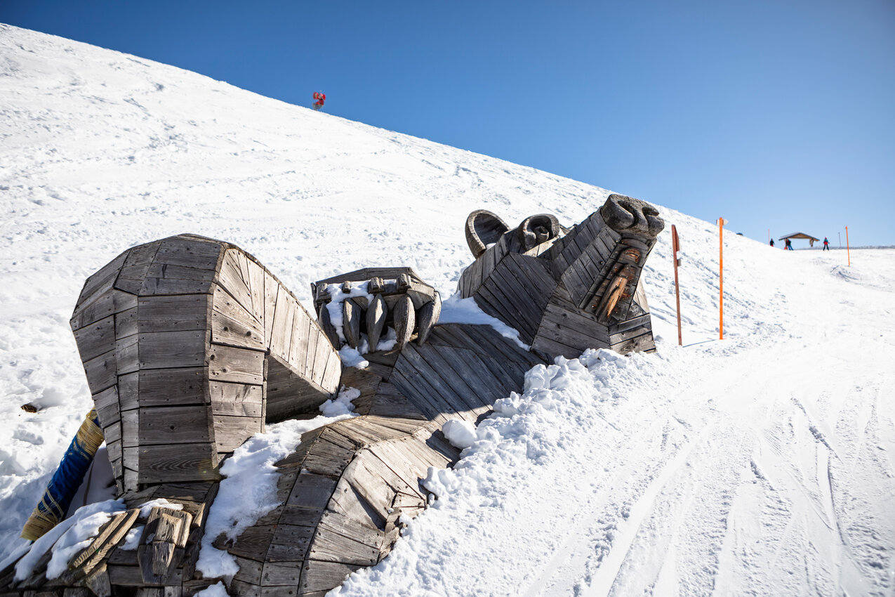 A wild time awaits skiers on the Bear Slope! The family slope starts at Alpkopfbahn top station and leads all the way down to the Kinderschneealm. Along the way, a number of creative features can be skied through, crossed and admired: the giant Bear’s Head, Bear’s Mouth and the Bear’s Belly. But mind you: You might feel a little queasy when you follow the descent right into the mouth of the Giant Bear!