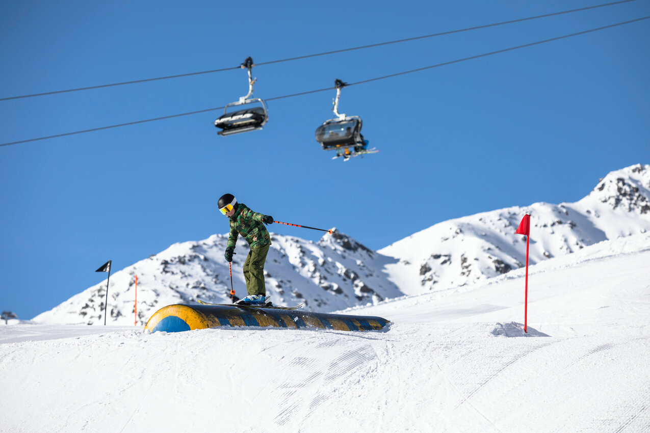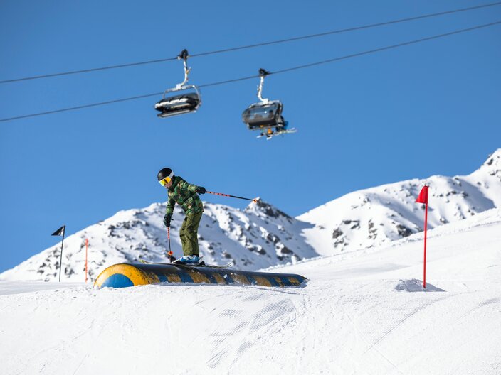 The Fun Slope leads to the Snowpark Fiss. Finish your run with a cool jump into the airbag. You can reach the Fun Slope by taking the Schönjochbahn to the top station. You want to run the Fun Slope Fiss as many times as possible? Then we recommend you to use the Schöngampbahn.