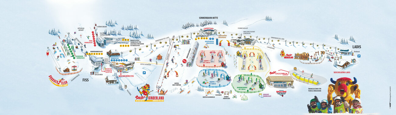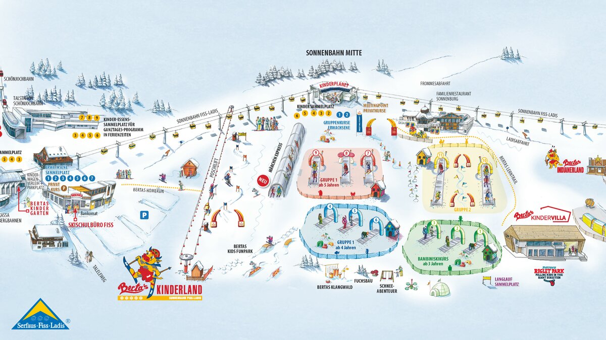 Au total, la région de Serfaus-Fiss-Ladis dédie 125 000 m2 exclusivement aux enfants, répartis entre 1 400 et 2 000 mètres d’altitude. À Serfaus, les paradis hivernaux des enfants sont le Jardin des neiges (directement en contrebas de la station supérieure de Komperdell) et Murmlipark (au centre du village). À Fiss-Ladis, les enfants retrouveront le parc Bertas Kinderland directement à côté de la station intermédiaire de Sonnenbahn. Au nombre de 250, les moniteurs et monitrices disposant d’une formation pédagogique enseigneront les joies du ski aux enfants, dans leur langue maternelle, en laissant la part belle aux jeux et à l'amusement.