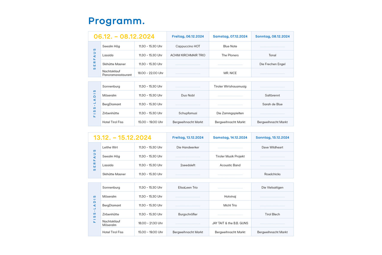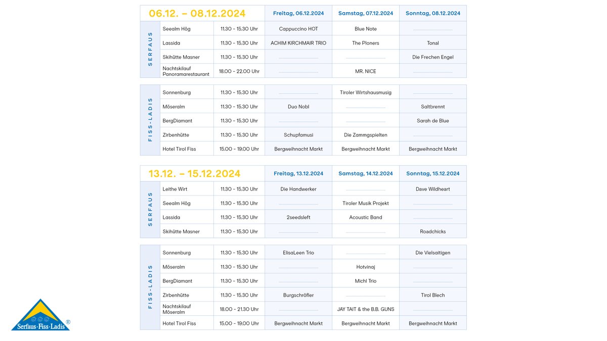 Een bijzonder hoogtepunt zijn de twee zaterdagen: op 6 december 2025 in Serfaus en op 13 december 2025 in Fiss wordt het festival verlengd met gratis nachtskiën. Hier komen trendy DJ-sets samen met culinaire hoogstandjes en ontstaat een belevenis die je niet snel vergeet.
