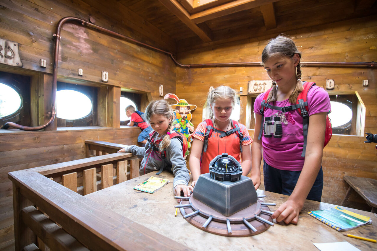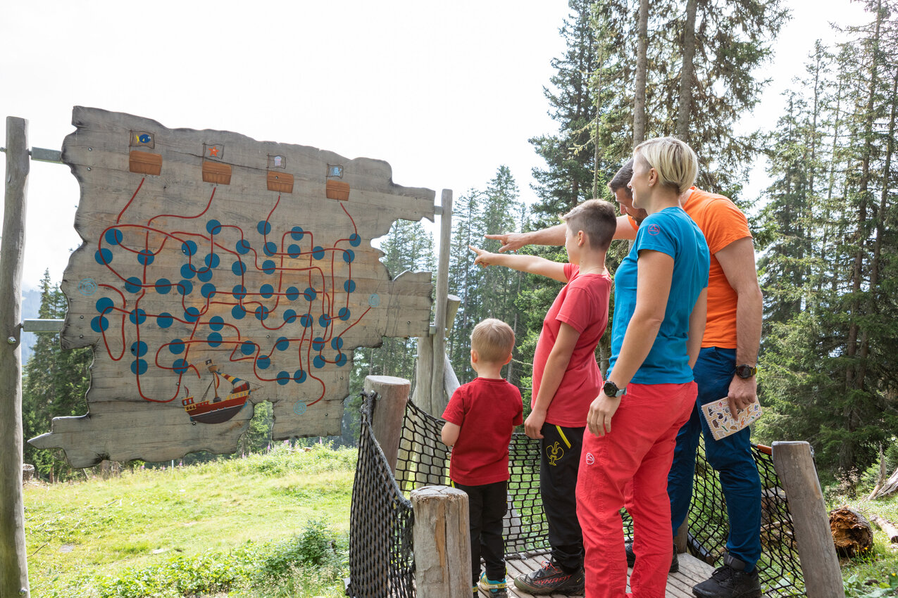 Nu kunnen de kinderen met het raadselblok op pad! Ga met de Komperdellbahn naar het bergstation. Het startpunt van het piratenpad is bij het Murmliwasser. Met het raadselblok in de hand kan de wilde raadselrally rondom kapitein Pepper beginnen.
